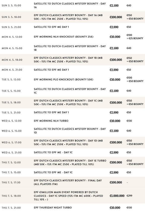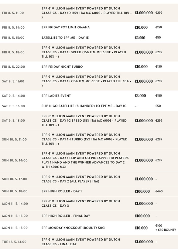 The EPF offers a diverse schedule filled with various events tailored to all preferences. From the thrilling Main Event to numerous side events and cash games, there is something for everyone. All participants can look forward to a vibrant poker community, professional dealers, and a welcoming atmosphere throughout the event.