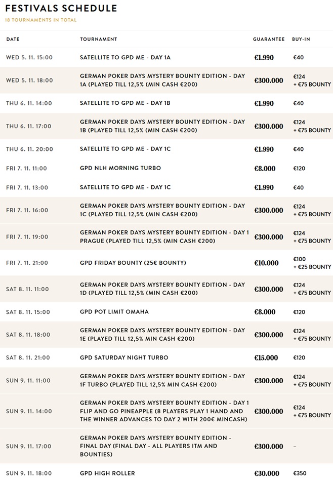 The German Poker Days will feature a comprehensive schedule, including multiple side events and satellite tournaments in addition to the Main Event. Players will have the opportunity to engage in a variety of formats and buy-in levels, catering to different tastes and skill levels throughout the festival.