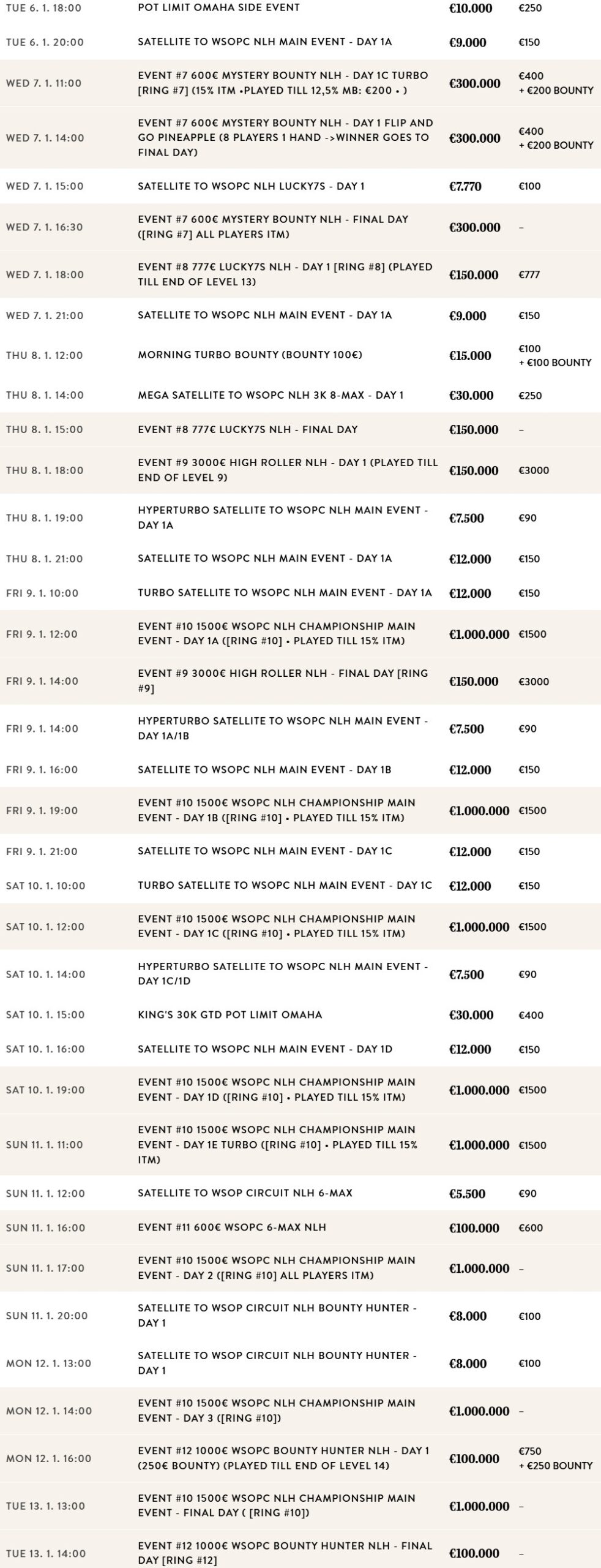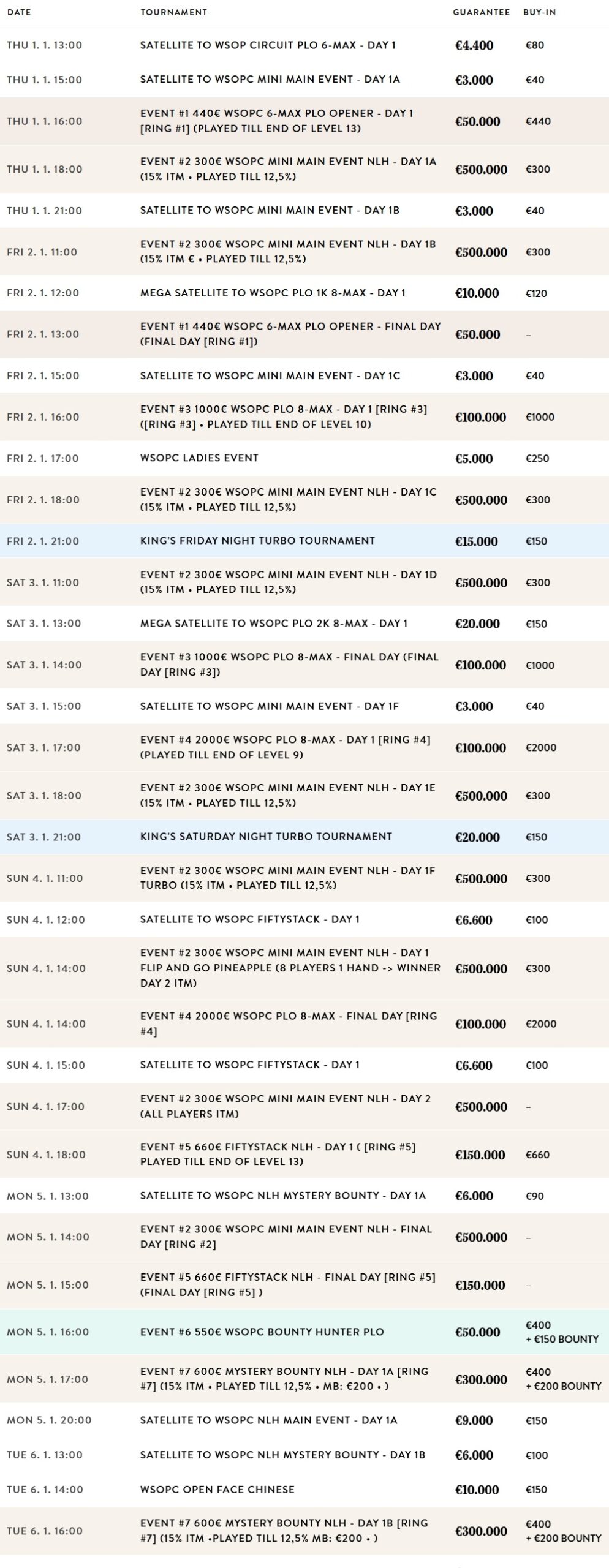 The WSOPC at King’s Casino features a comprehensive schedule packed with thrilling tournaments to keep you engaged throughout the event. Highlights include: